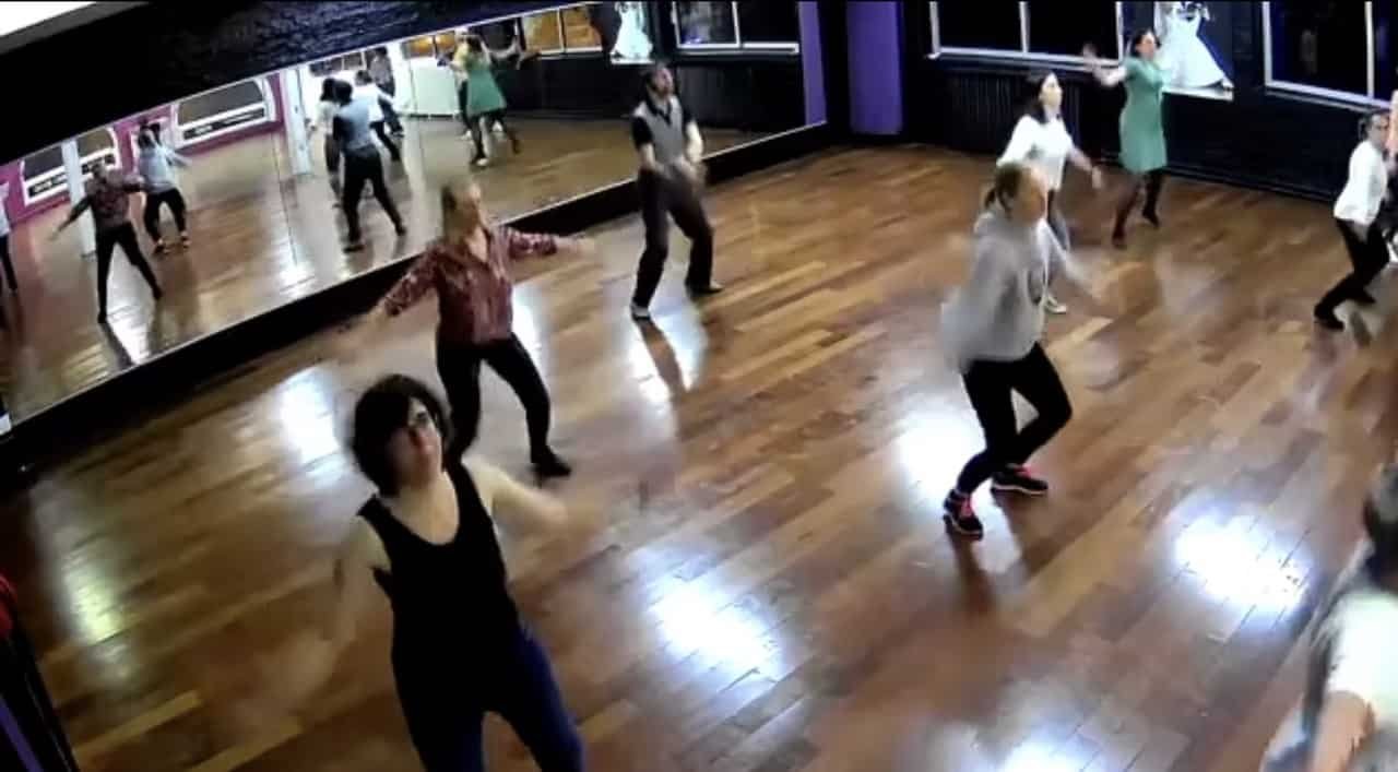 Matteo débute par un échauffement en faisant quelques exercices de rythme, rebond et style. Une fois bien échauffés et placés en cercle, on va travailler des pas emblématiques du jazz roots.