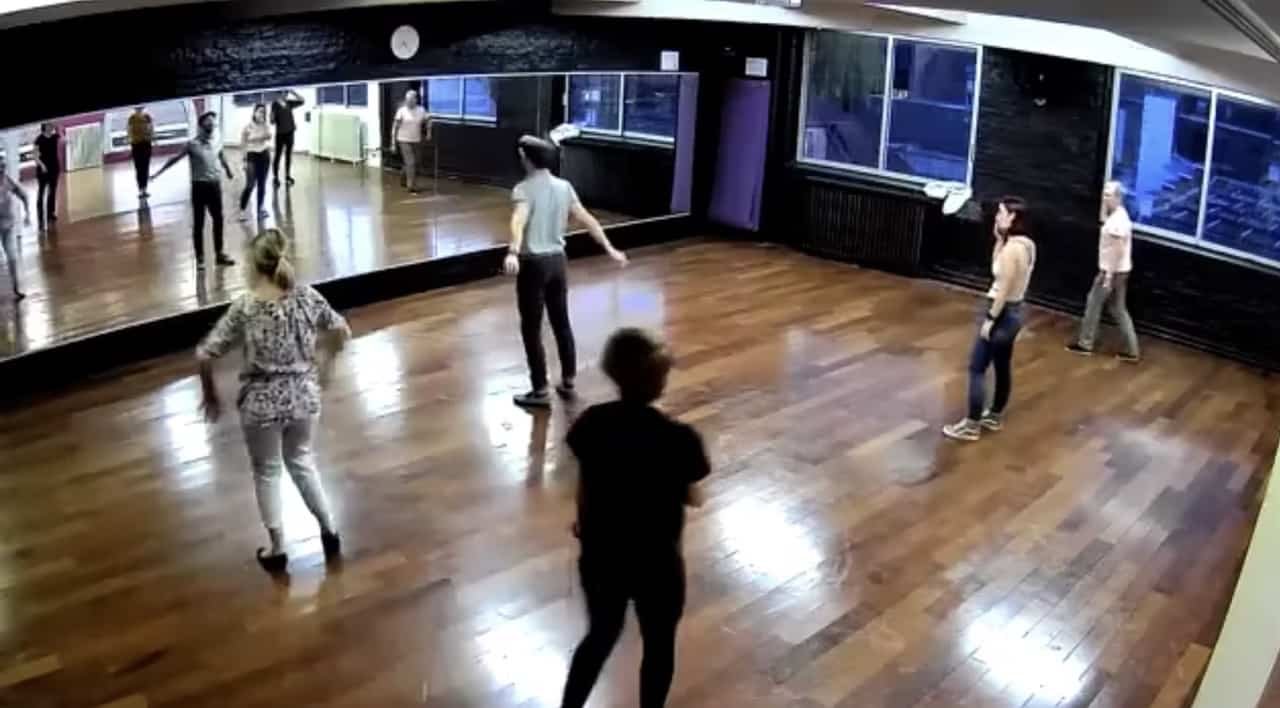 Matteo débute par un échauffement en faisant quelques exercices de rythme, rebond et style. Une fois bien échauffés et placés en cercle, on va travailler des pas emblématiques du jazz roots.